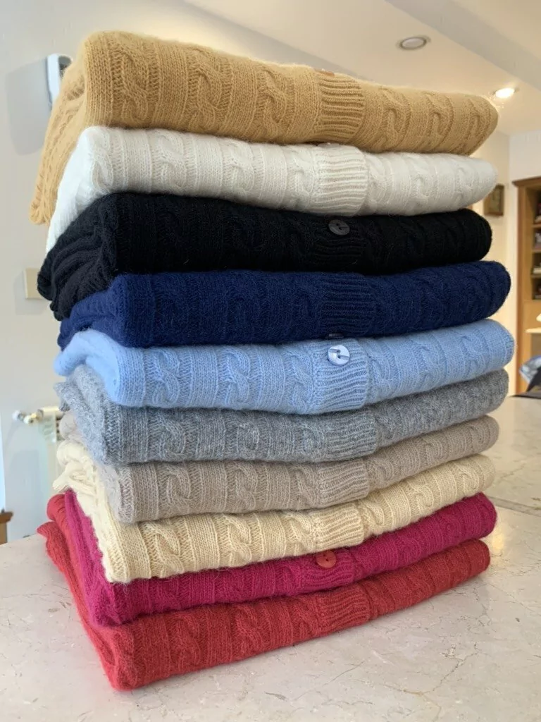 El cárdigan con ochos está confeccionado en lana y pelo doble.