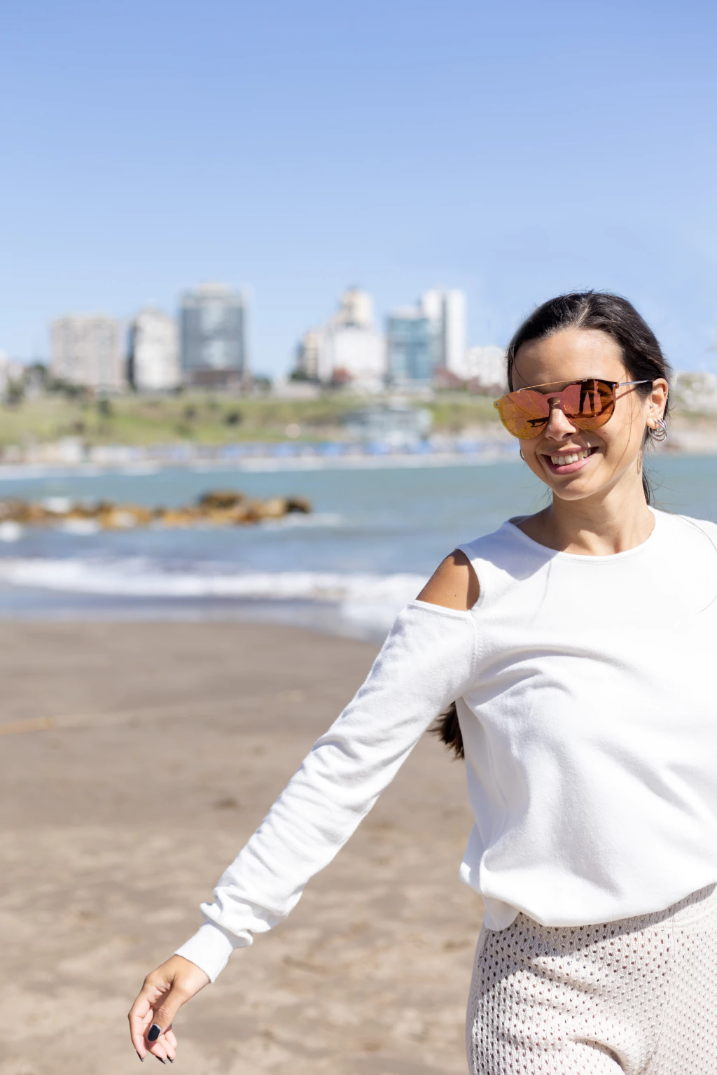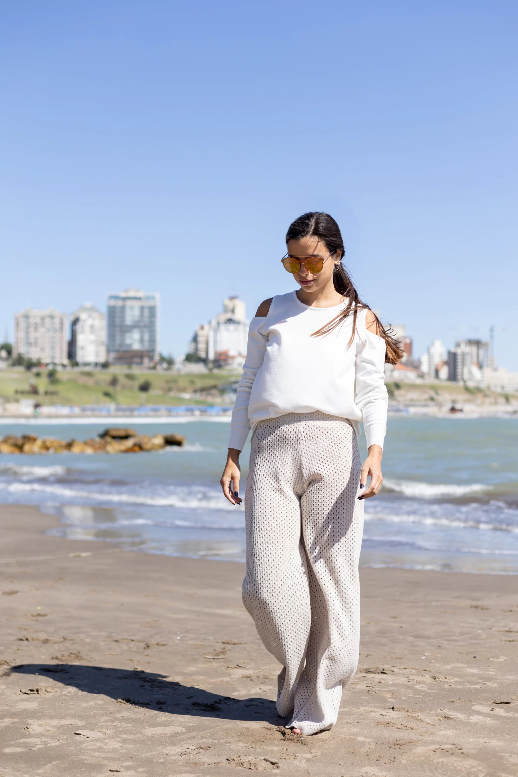 Sweater en tejido suave con diseño de hombros descubiertos.